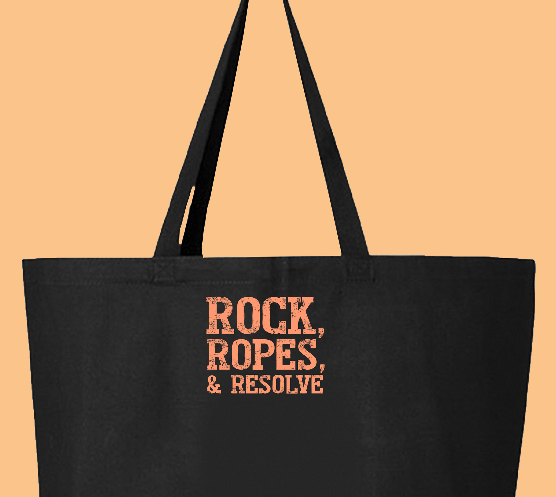 Proudly display your Cliff Craft with the "Rock, Ropes, & Resolve" Peach Tote Bag!